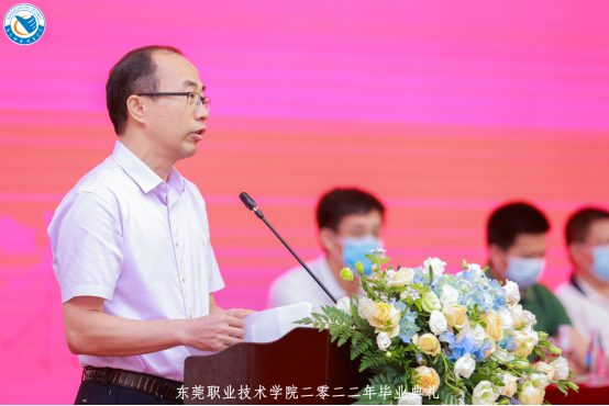 校长贺定修在典礼上致辞。他向顺利完成学业的同学们表示祝贺。他表示,三年前同学们不约而同从四面八方来到东职展开青春的画卷,在东职这片热土上孜孜以求、努力拼搏,共同绘就了东职追求卓越的崭新画卷。
