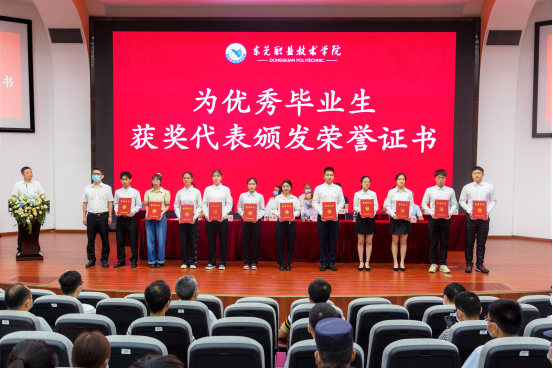 校党委副书记、纪委书记蔡东宝向获表彰的优秀毕业生代表颁发荣誉证书。党委书记朱益民为毕业生代表颁发毕业证书,并与同学们一一握手祝贺。