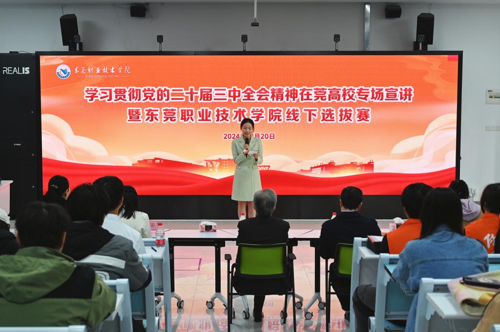 经过初赛和复赛两级评选,共有10名参赛选手进入学校决赛。决赛现场,选手们从自身出发,围绕“青年学”“青年思”“青年梦”等方面,发挥专业优势和创新思维,通过故事分享、情景宣讲、互动宣讲等方式,结合莞邑青年学子在东莞高质量发展中的担当作为,生动诠释党的二十届三中全会精神。